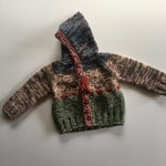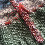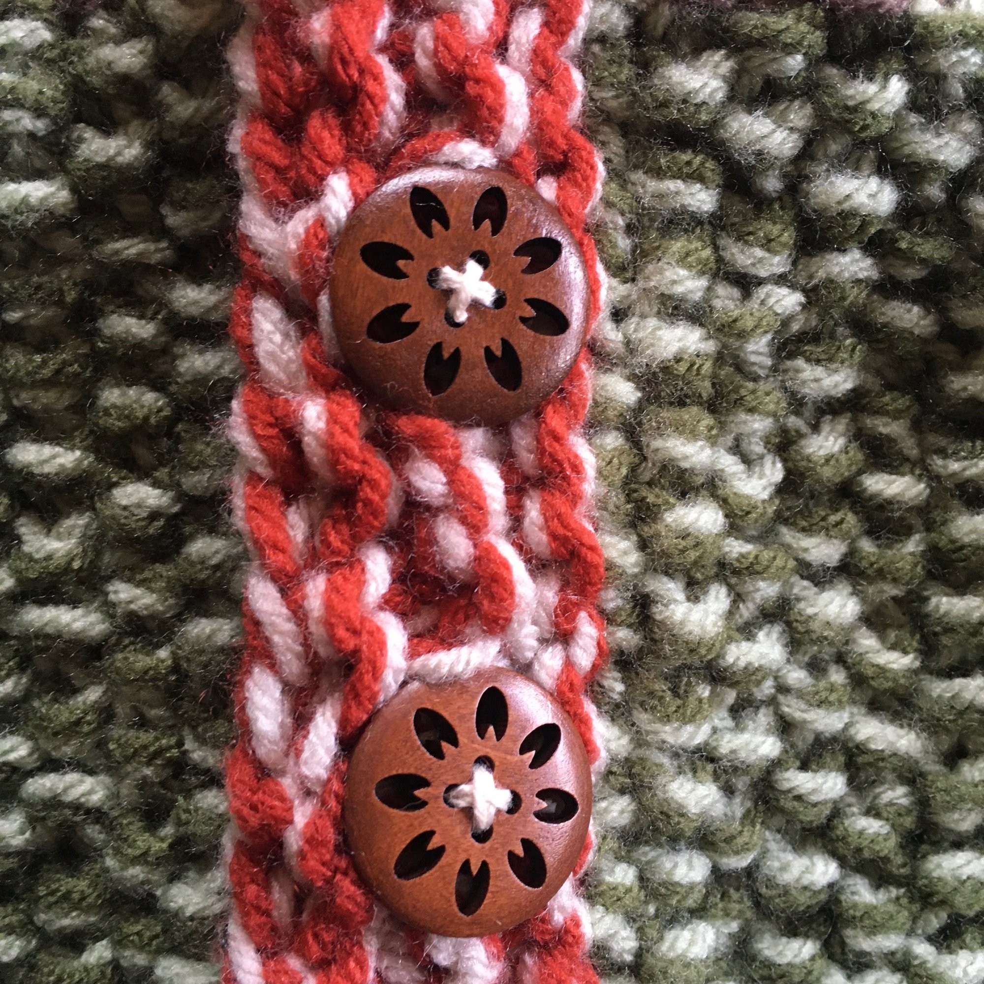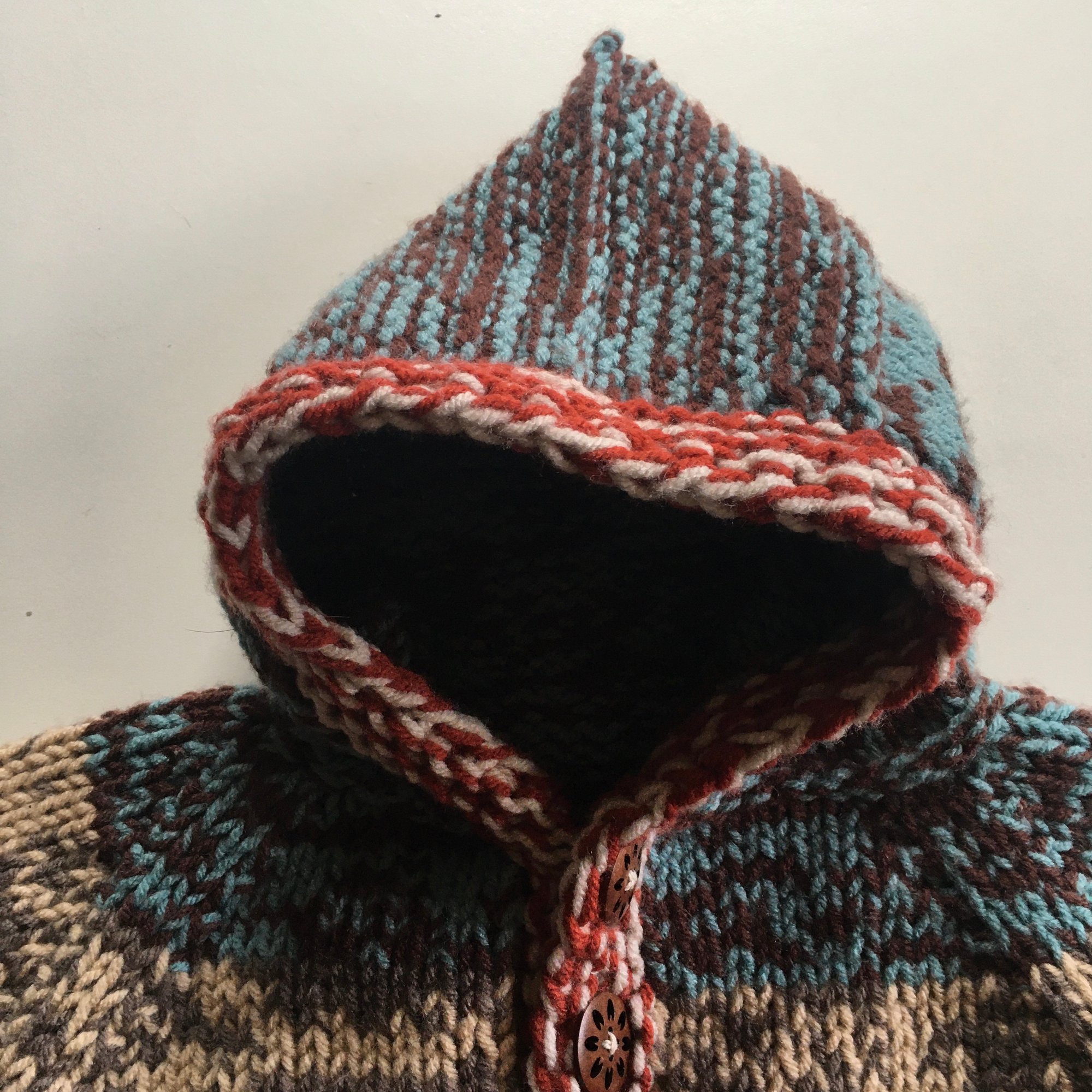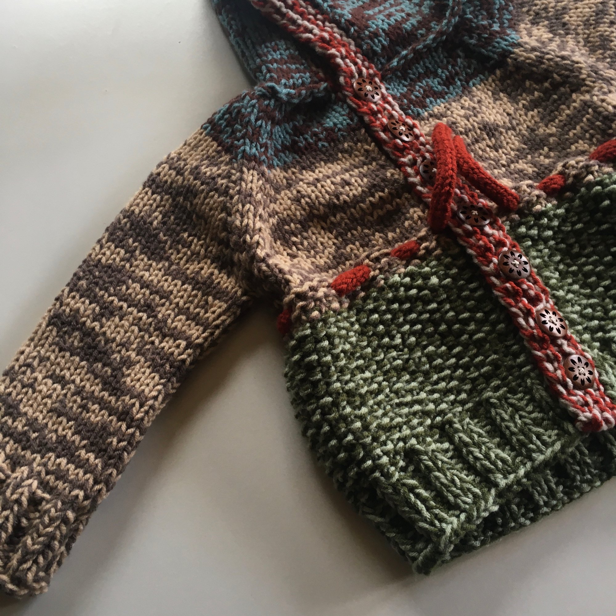 Hand knit with double stranded yarn to create a thick warm fabric. This little coat is big enough to add layers for extra chilly days, Or to wear over sized as is.