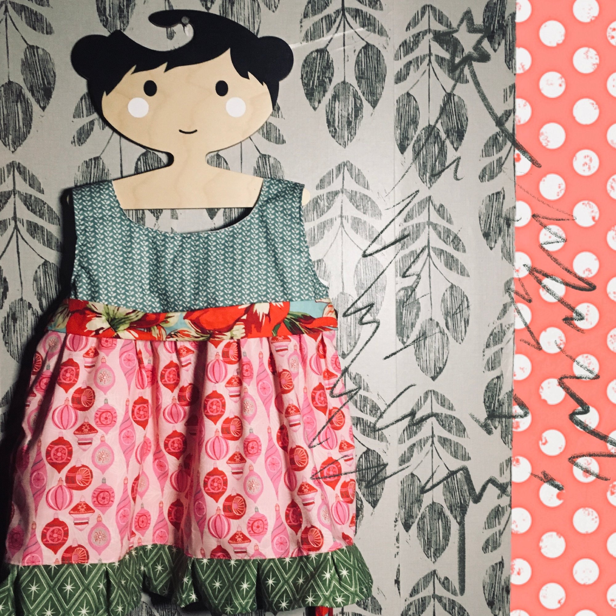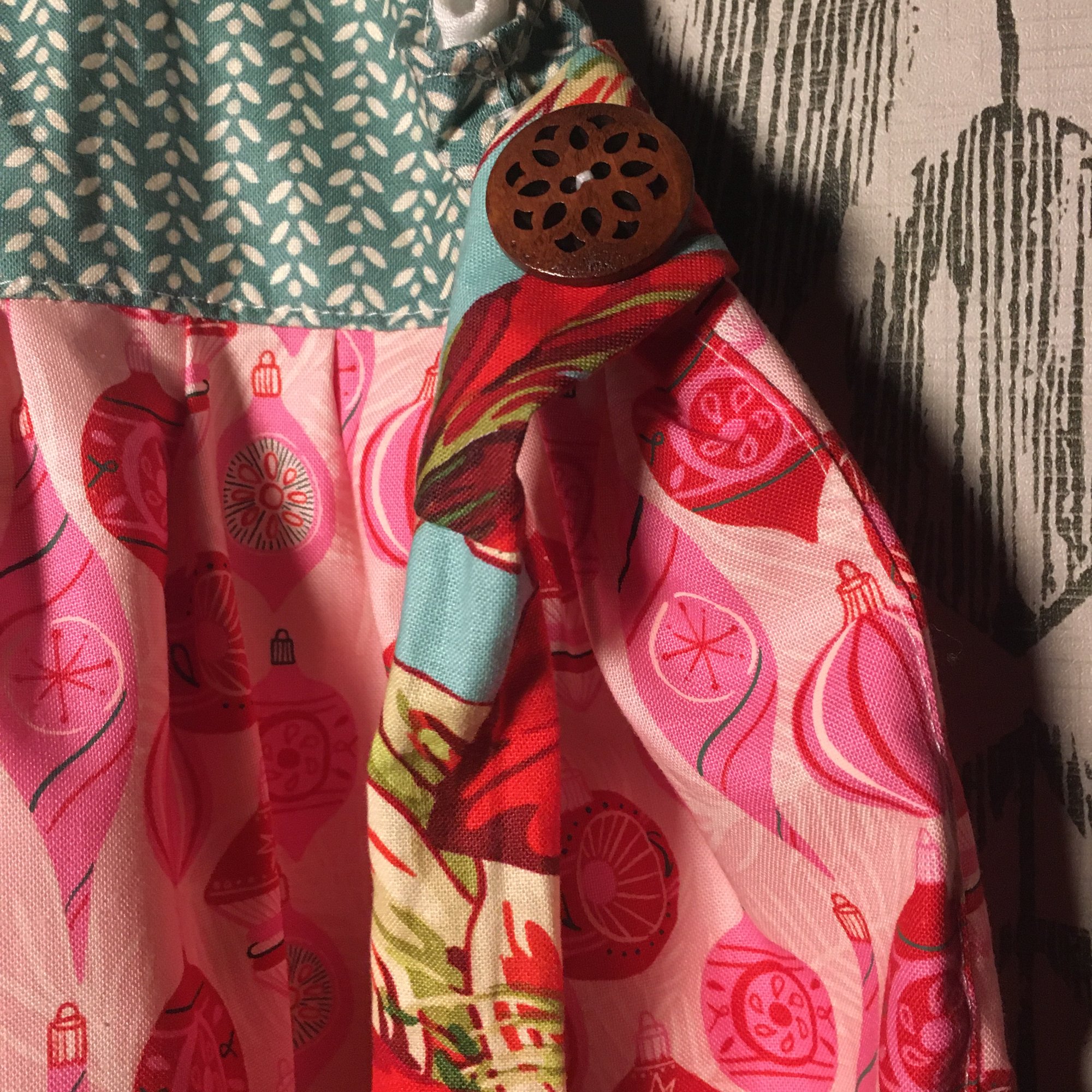 Holiday play dates? Christmas shopping? This babydoll top is ready to add a little holiday sweetness to all those moments. Hand crafted with a double attached slip. A long contrasting waist tie, with sweet little wood button decorations on either side.