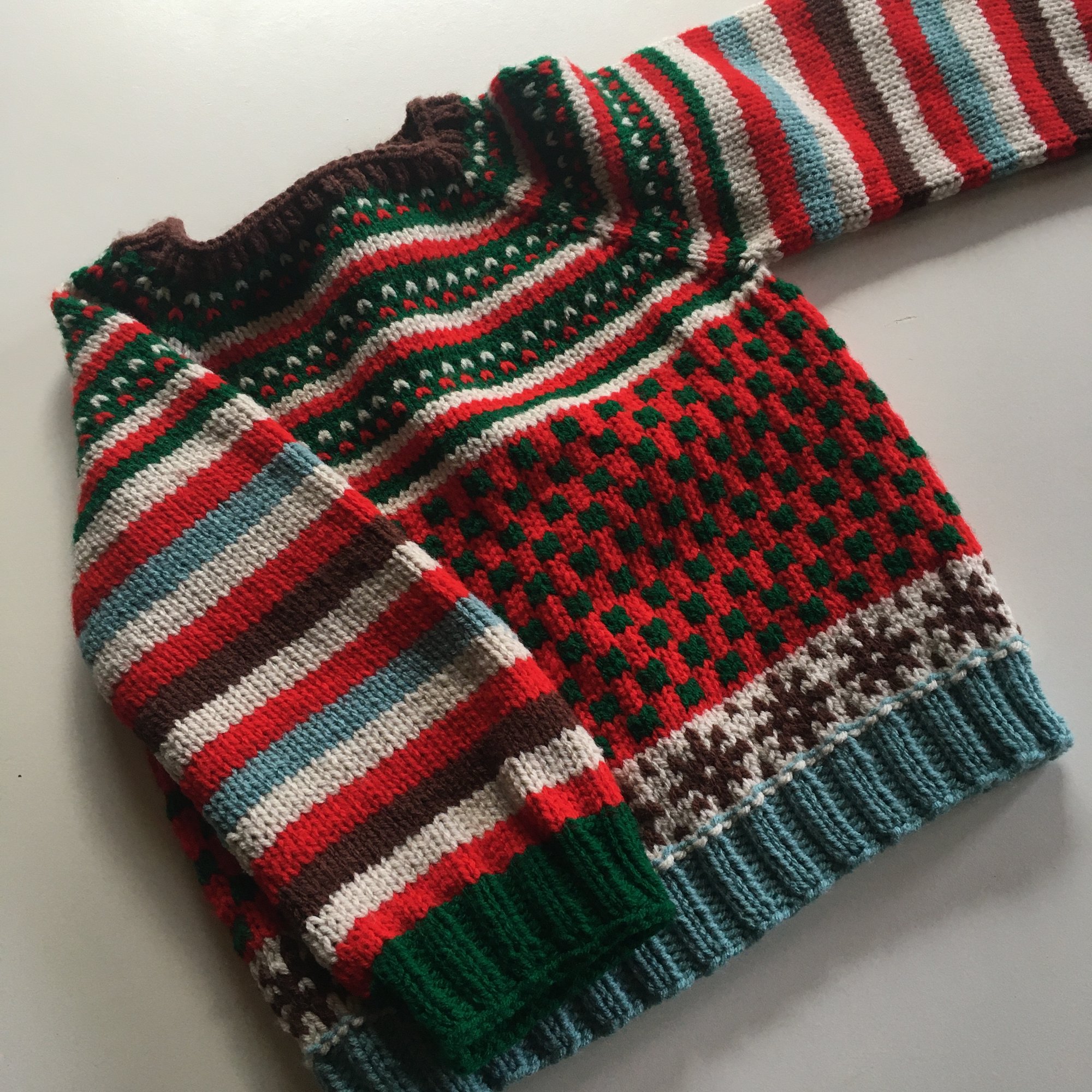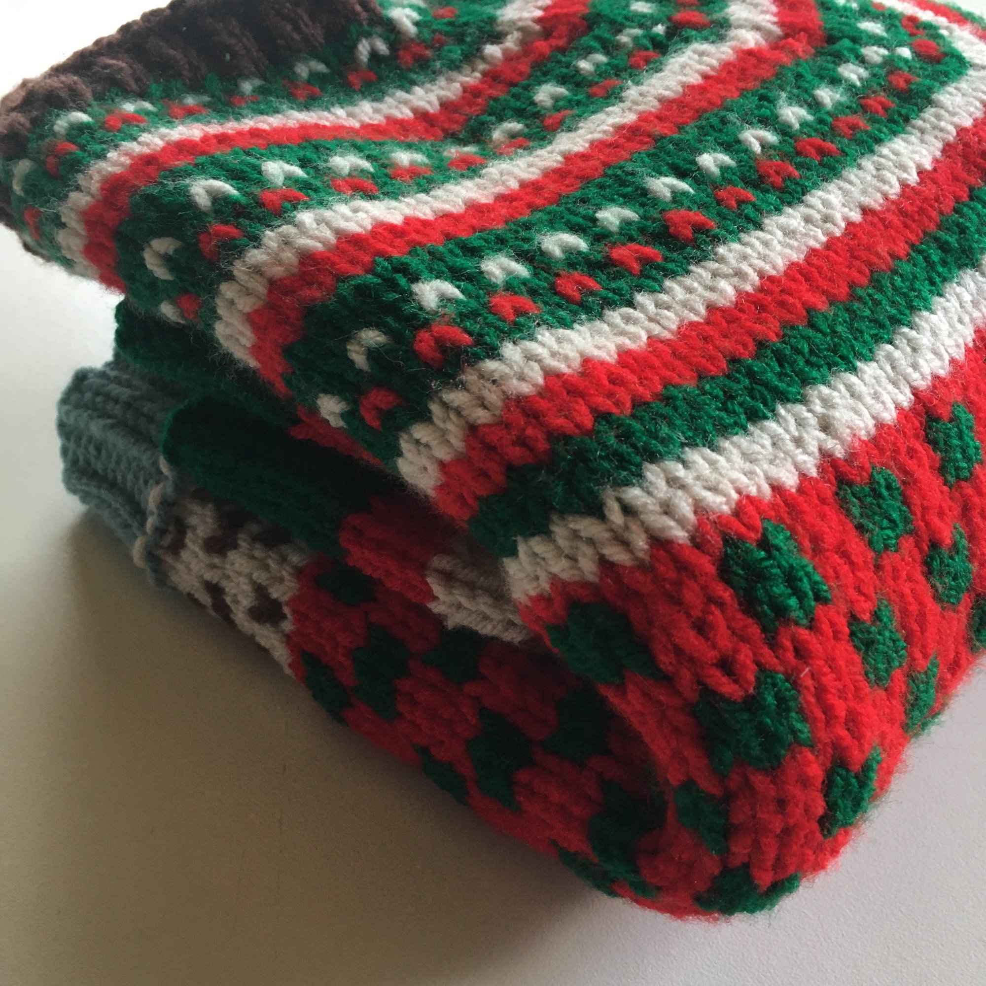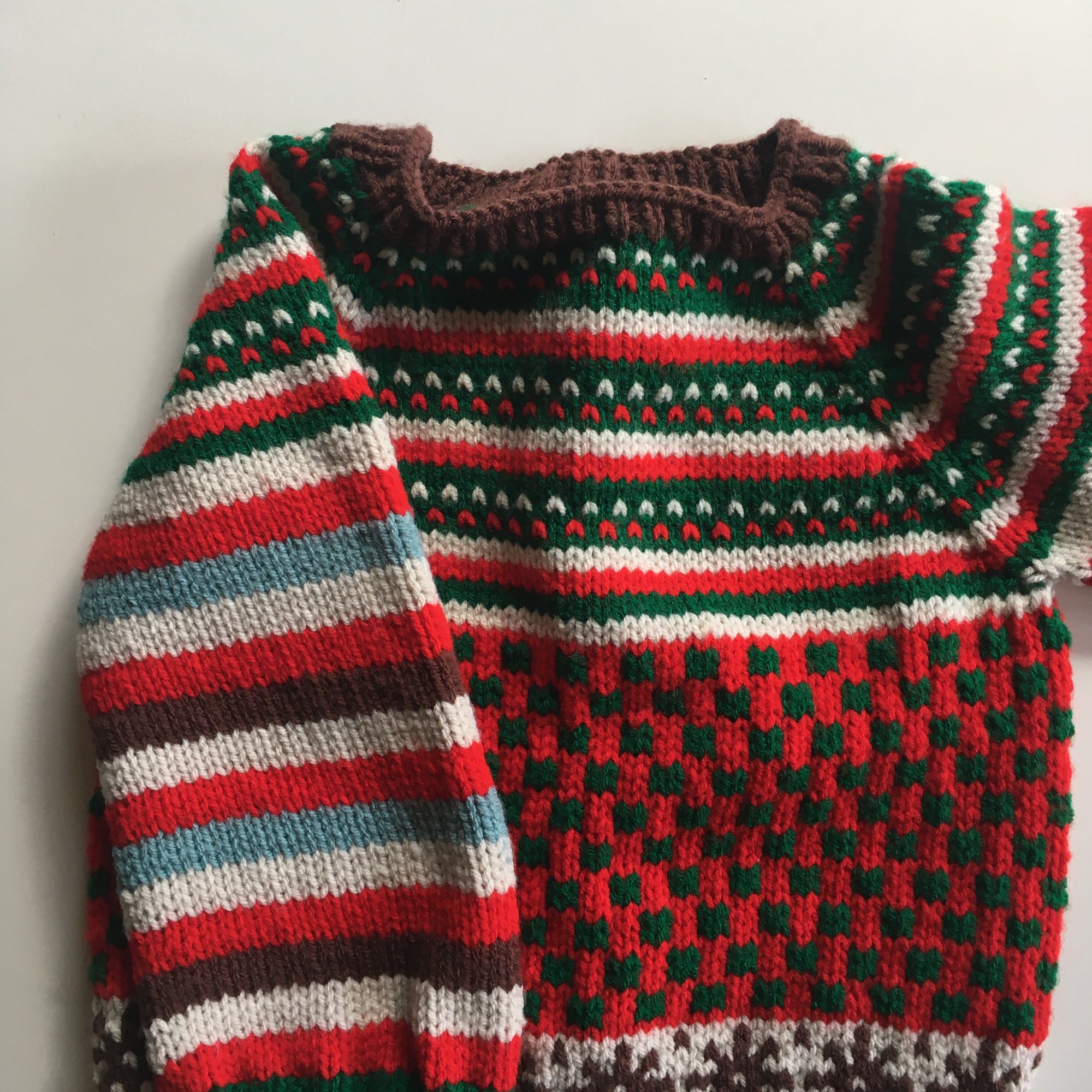 Hand knit in classic Christmas colours this pull over is ready for all your holiday adventures.