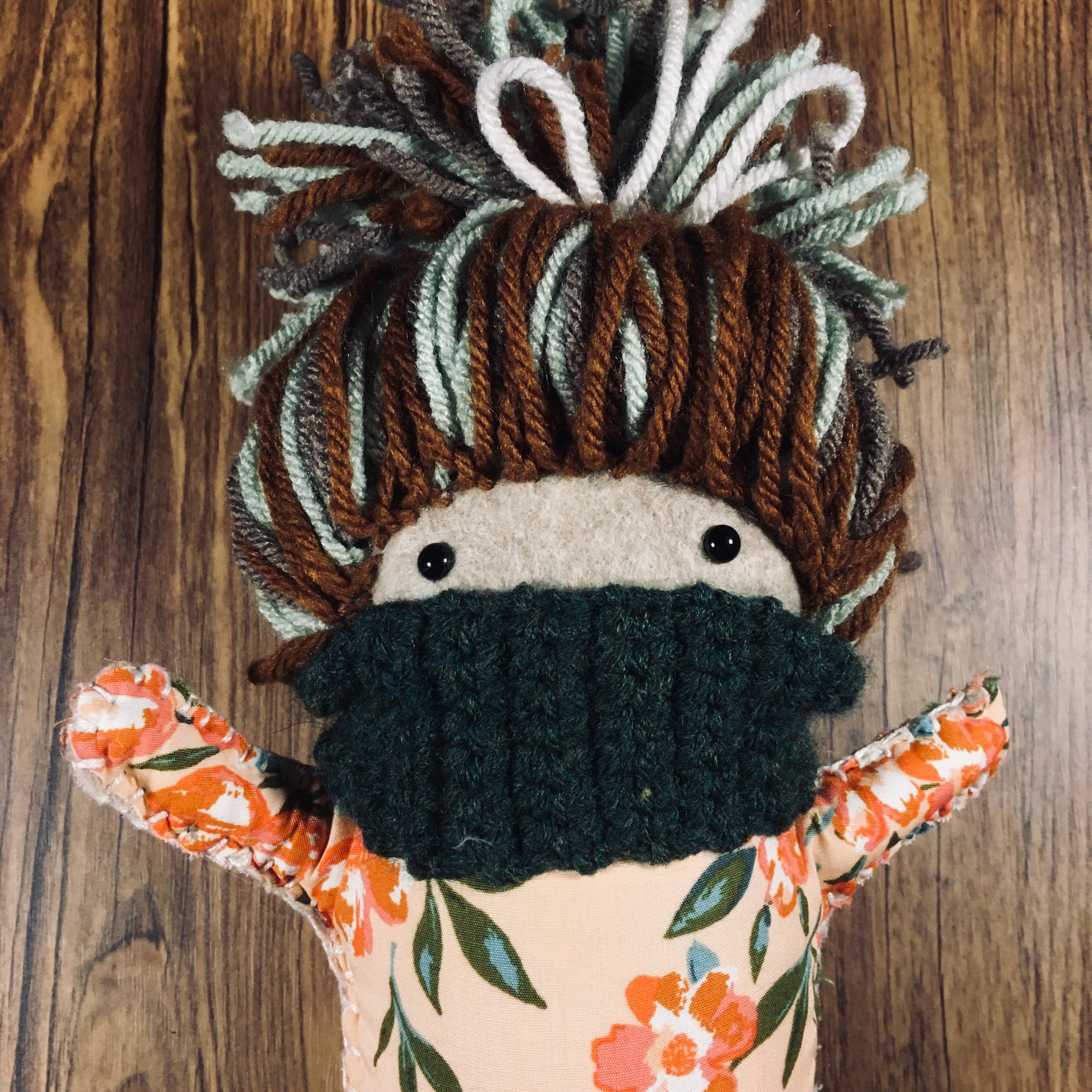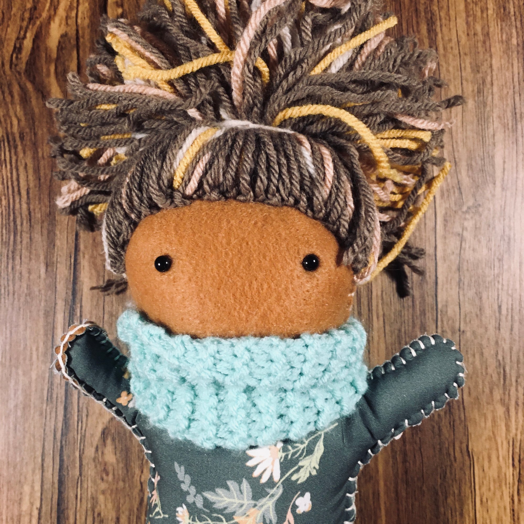 The large sized bobby has a full felt body with cotton clothing, hand knit or crochet scarf, safety eyes, multi colored yarn hair and stuffed with a hypoallergenic poly FIL.