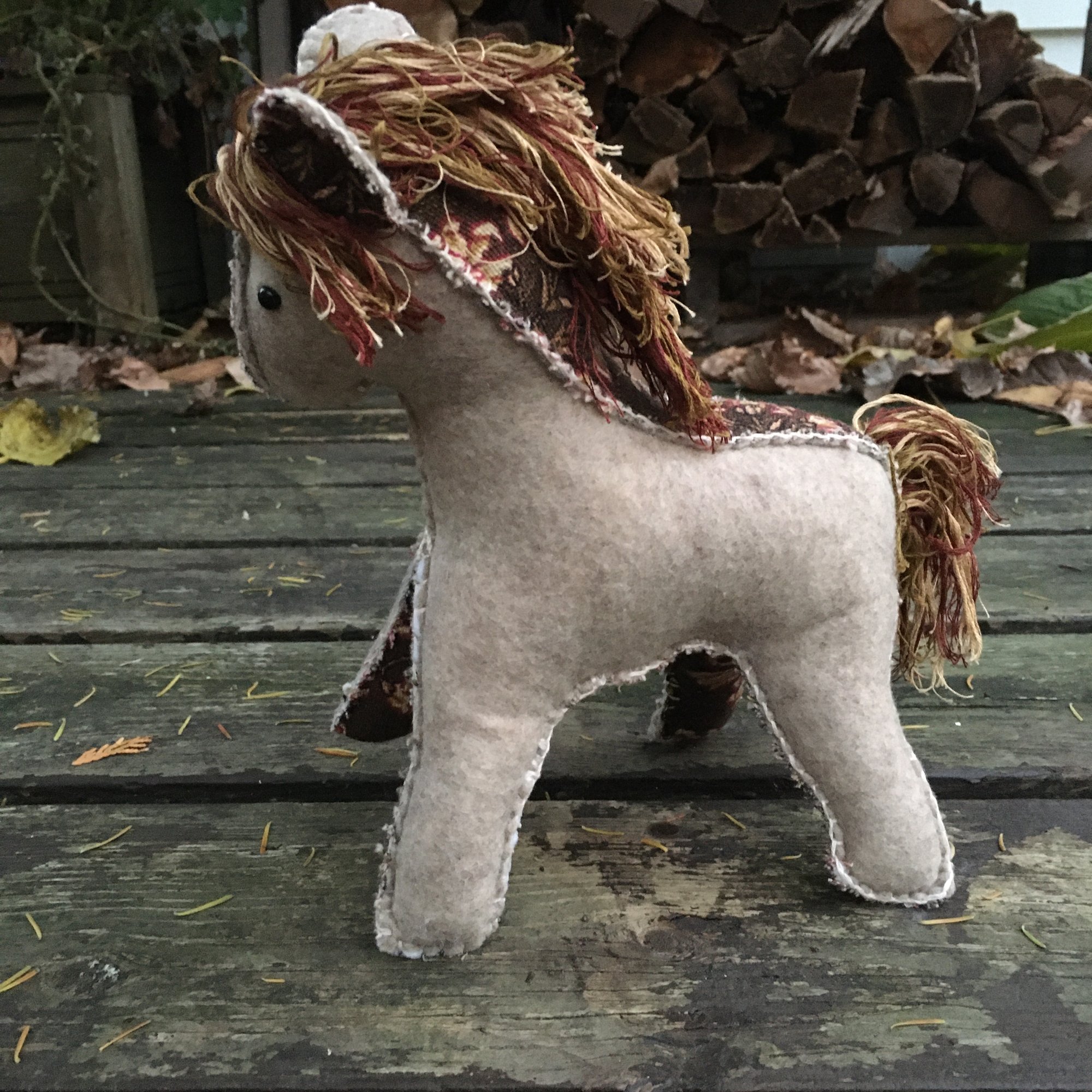 Felt body, canvas accents, safety eyes, thread mane and tail, and a hypoallergenic poly stuffing make up this one of a kind hand stitched horse.