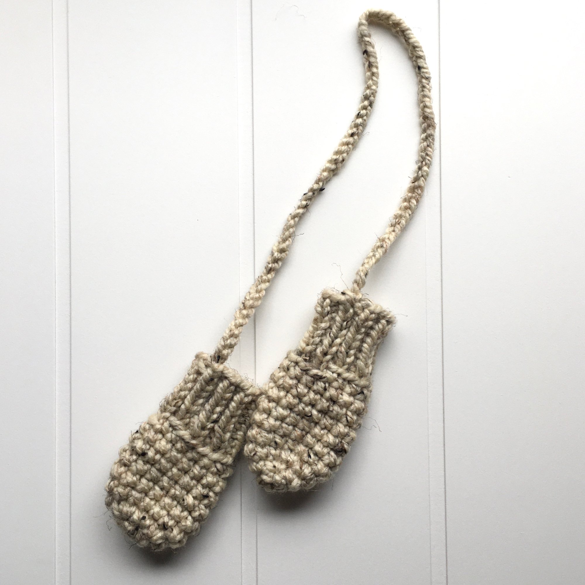Crochet thick wool blend mittens on a string.