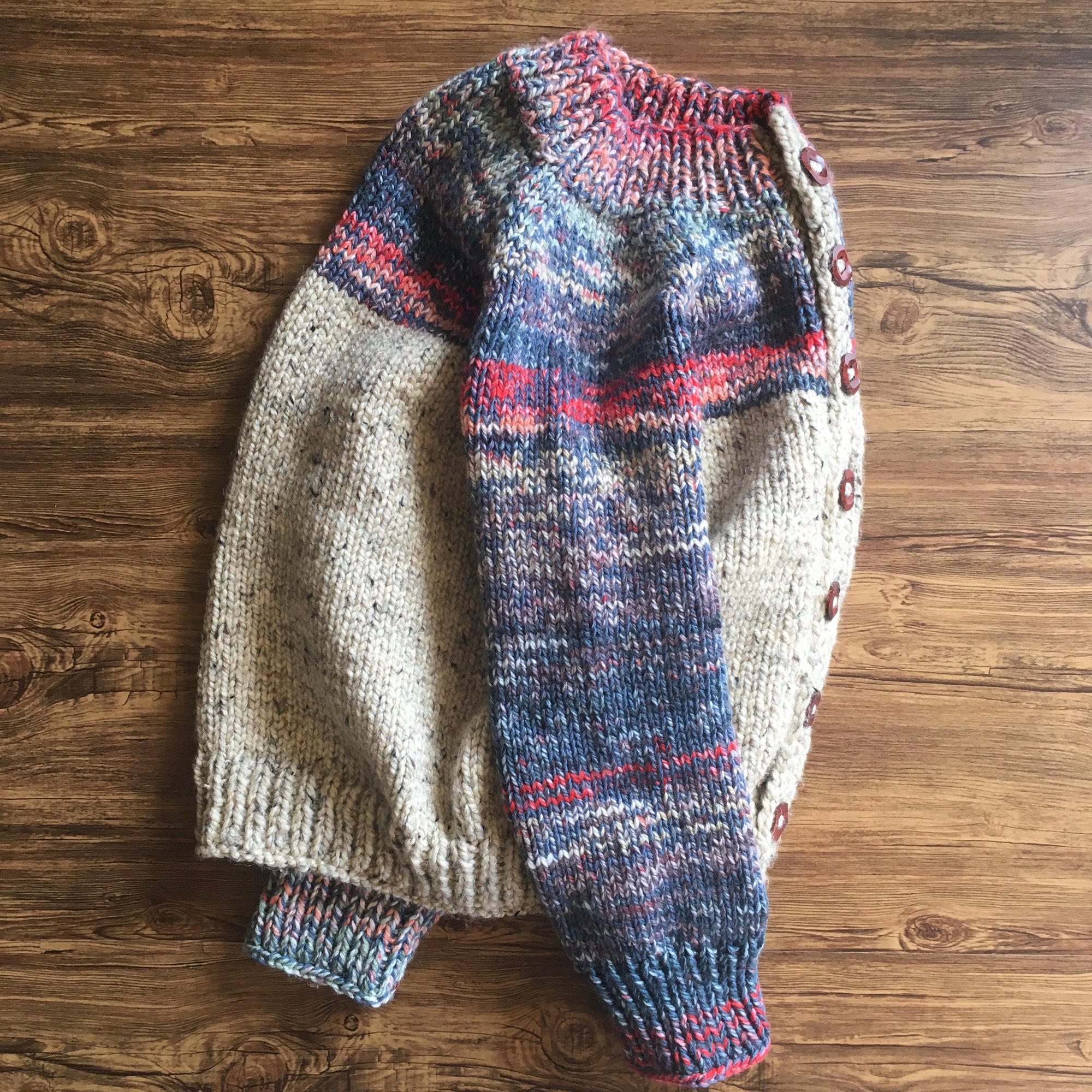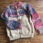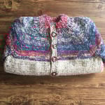 Hand knit one of a kind thick cardigan. Knit with a blend of cotton, wool, & acrylic yarns. Sized as an adults medium, large.