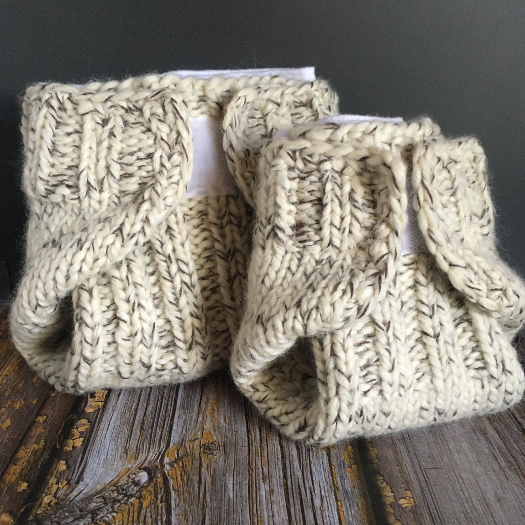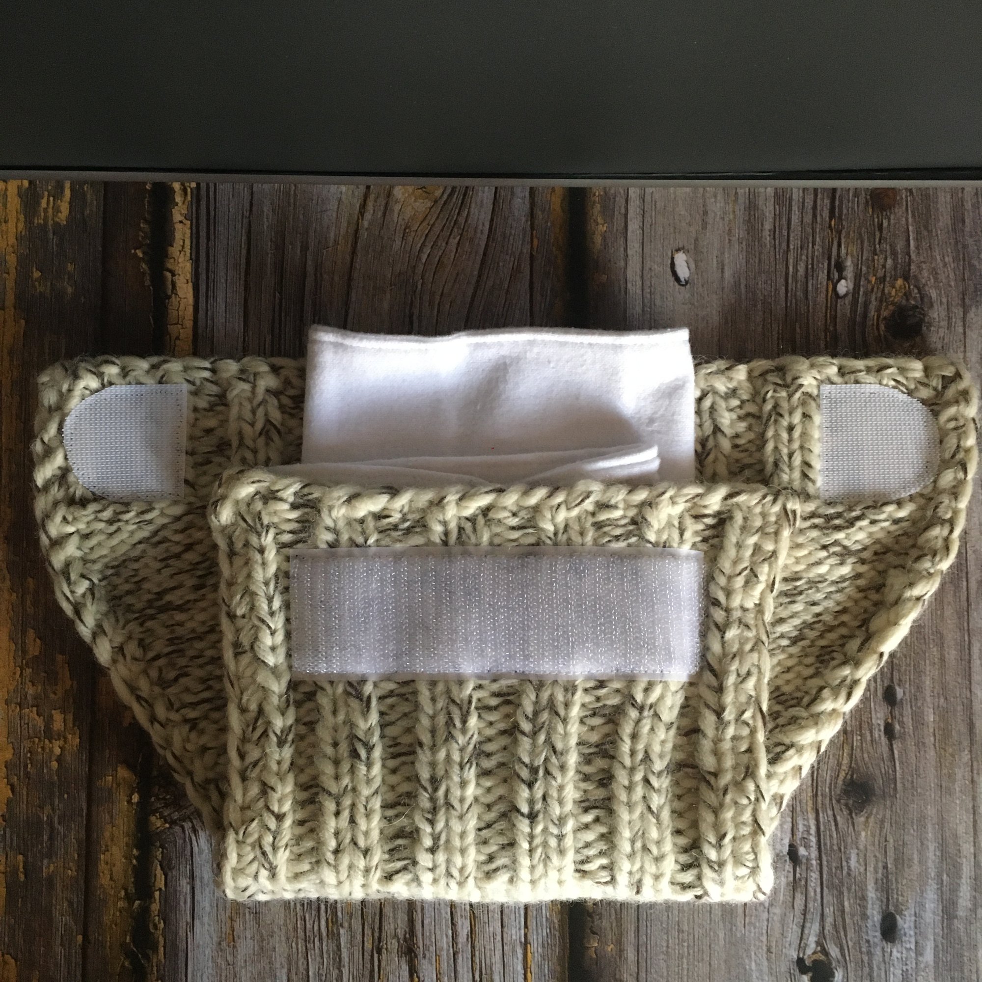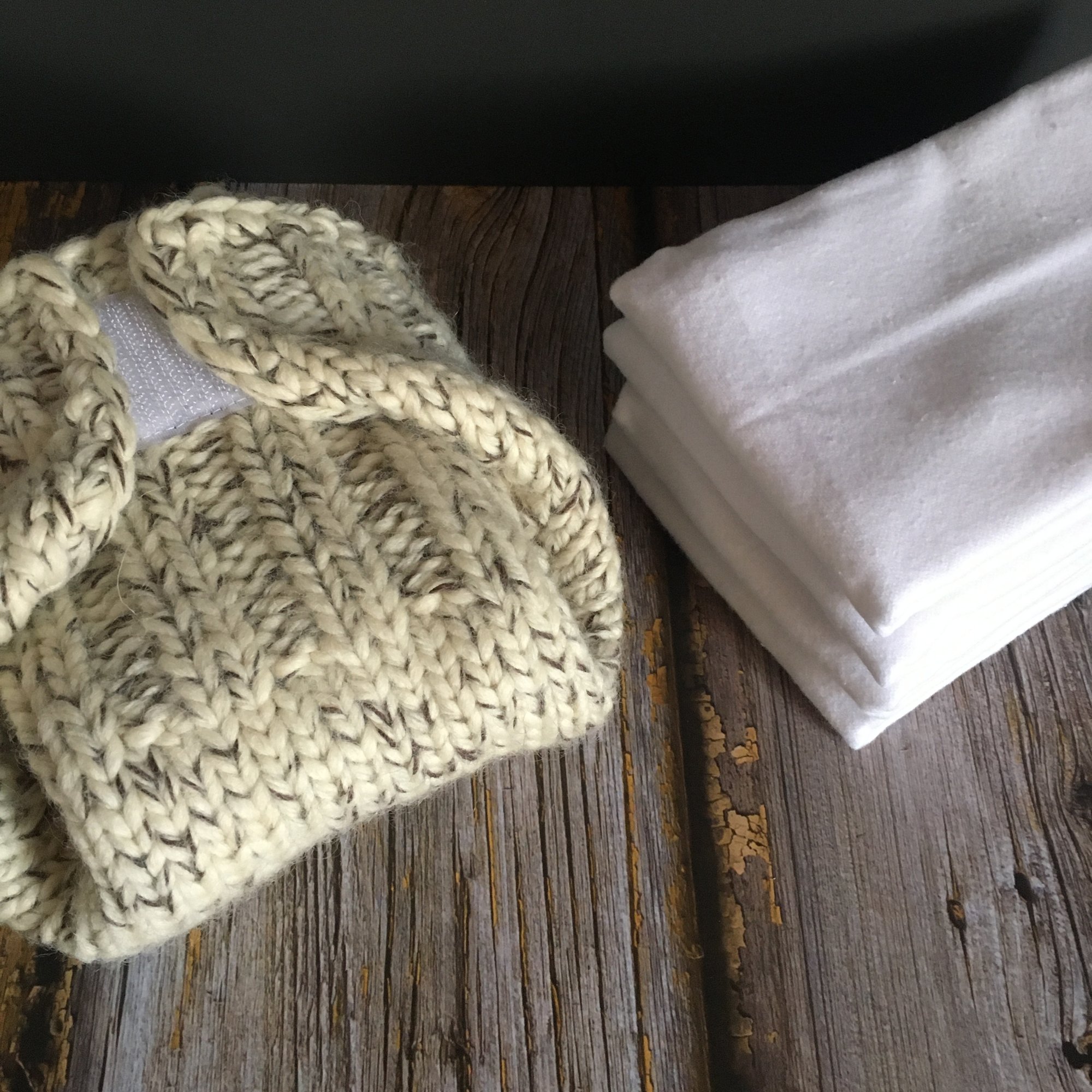 The signature style consists of a thick roving wool, stranded with 100% new wool. Making this cover perfect for day and night. Aplix closures for quick and easy changes. Each cover comes with four 2 layer cotton flannel tri-fold liners, This allows for 6 full layers of absorbency, and can also double as a pre fold diaper.